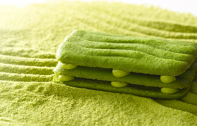 Its three elegantly curved and perfectly baked matcha langue de chat layers are separated by matcha chocolate pillars,